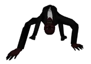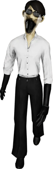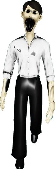 - Akihito Uchiumi is a tall, lanky man with dark brown hair. He wears a dirty buttoned-up white shirt with soft black pants and shoes, and his eyes are completely white, behind dark glasses. Akihito's arms are slender and bony with long and sharp nails that are pitch black. He has a large, gaping mouth. On his face are black veins, which only stretch out to the side, below, and over his mouth. His jumpscare shows black tendrils (or tentacles) wriggling from the inside of his gaping mouth, similar to Shosai.