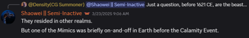 - According to a lore writer, living humans (such as the protagonists) that went into The Mimics' pocket dimensions will experience abnormalities to their organ systems and metabolisms.[6]