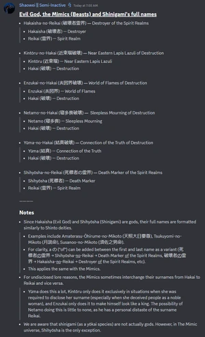 All of the Mimics share the surname Hakai (破壊)[3]. However, for undisclosed reasons, the beasts sometimes choose to use their father Hakaisha’s surname, Reikai (霊界), when disclosing their names. Netamo, on the other hand, typically uses his own surname. Yuma frequently changes the surname she goes by, while Kintoru often switches hers when she needs to present herself as a noblewoman. Enzukai uses Reikai to make himself appear more like a king. Netamo is the least likely to change his surname, as he personally dislikes his father’s surname.