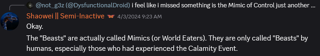 - The Mimics are demons/supernatural entities. Their term "Beasts" are referring to their monstrous forms and not their species.